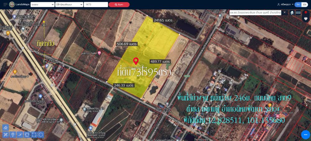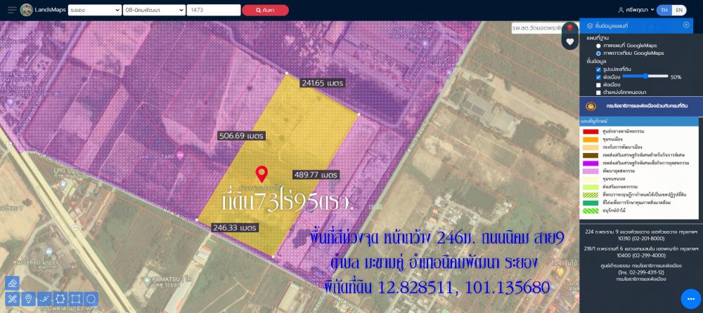 ขายที่ดิน73ไร่95ตารางวา พื้นที่สีม่วงจุด หน้ากว้าง 246ม. ถนนนิคม สาย9 ตำบล มะขามคู่ อำเภอนิคมพัฒนา ระยอง