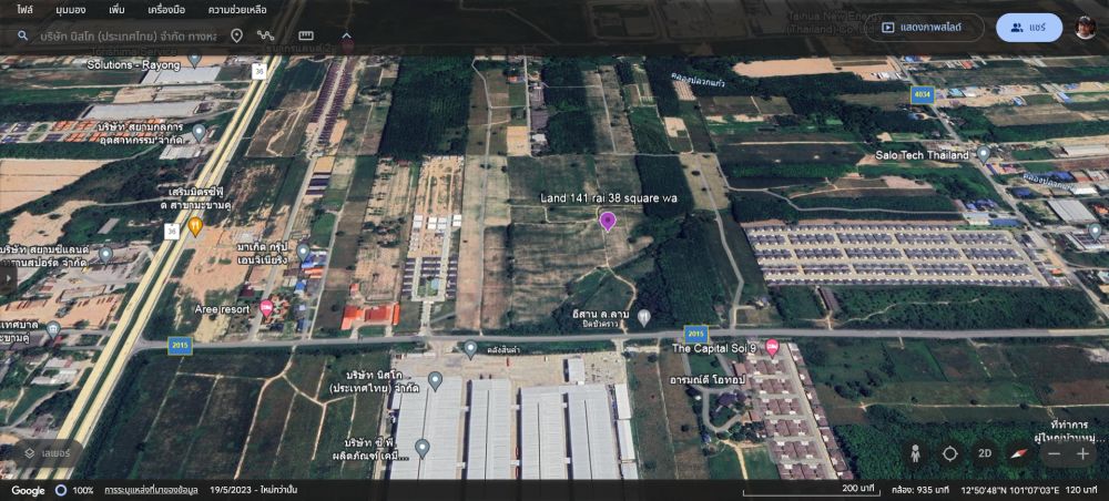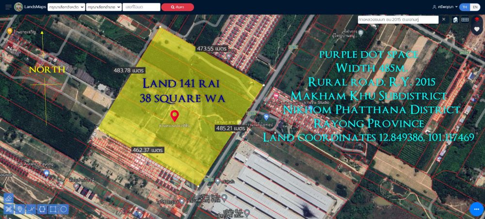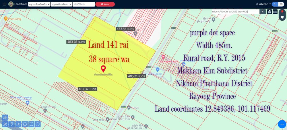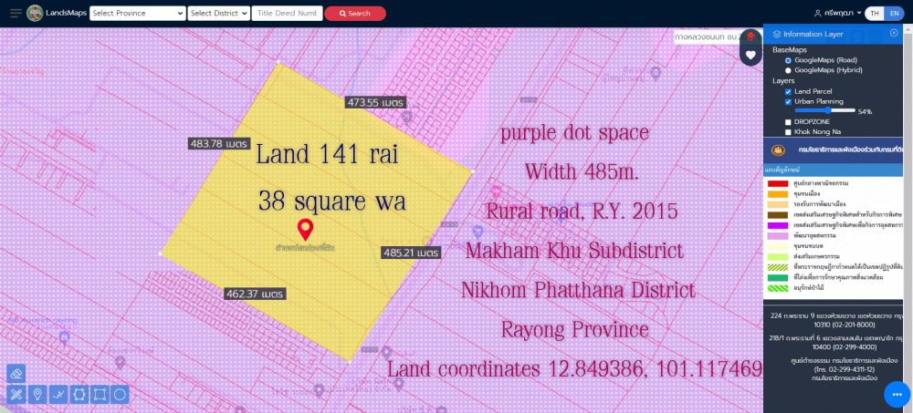 ขายที่ดิน 141ไร่ 38ตารางวา พื้นที่สีม่วงจุด หน้ากว้าง 485ม. ถนนทางหลวงชนบท รย.2015 สาย13 ซอย9 ตำบล มะขามคู่ อำเภอนิคมพัฒนา ระยอง
