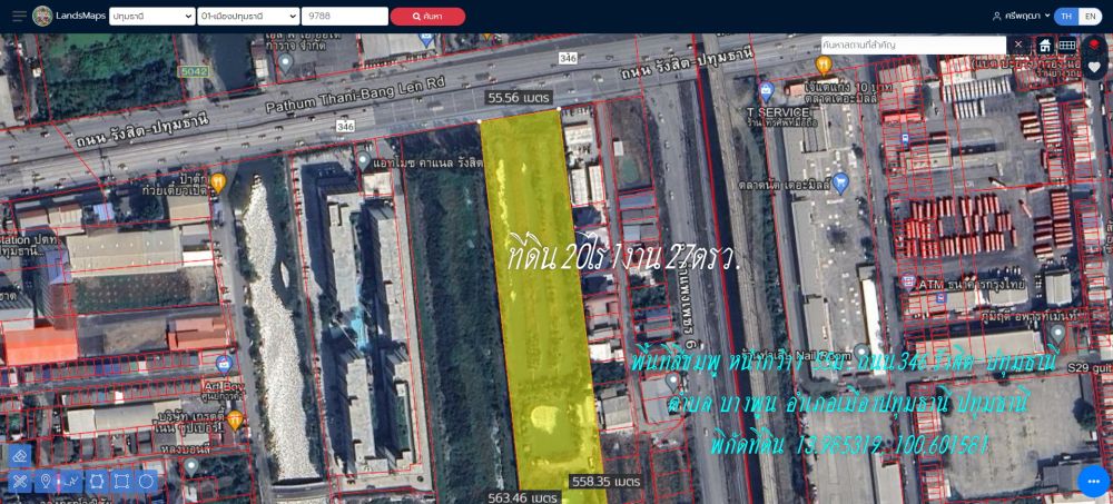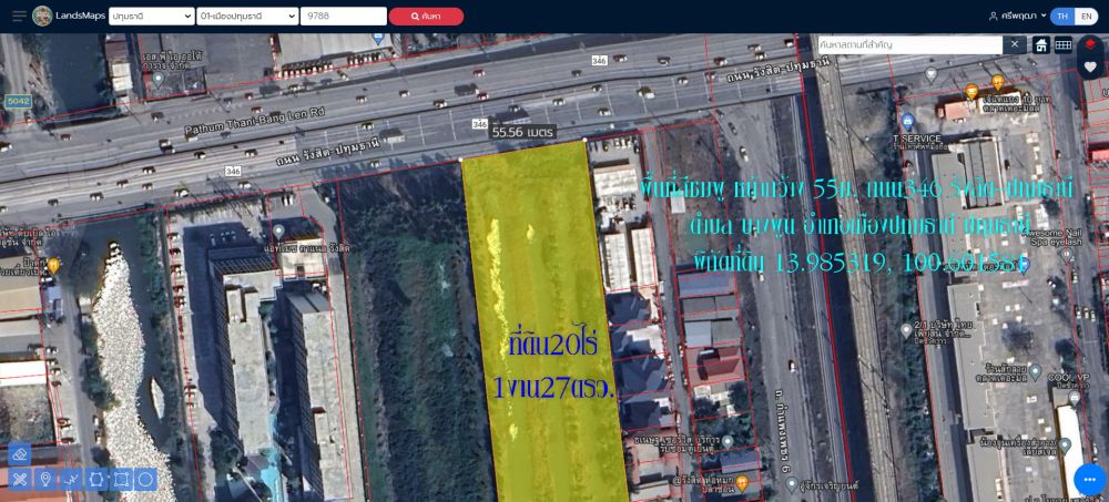 ขายที่ดิน 20ไร่ 1งาน 27ตารางวา พื้นที่สีชมพู หน้ากว้าง 55ม. ถนน346 รังสิต-ปทุมธานี ตำบล บางพูน อำเภอเมืองปทุมธานี ปทุมธานี