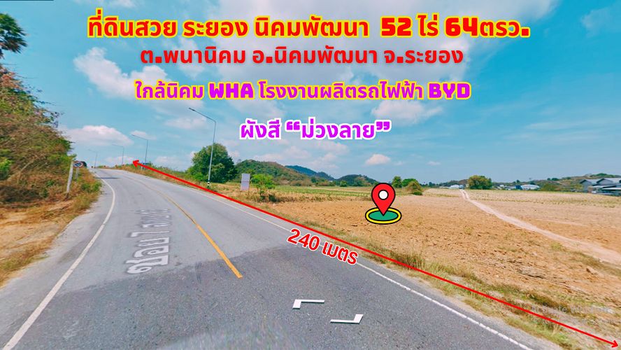 ขายที่ดินระยอง นิคมพัฒนา 52ไร่ 64ตรว. ใกล้ทางหลวงสาย 36 ใกล้นิคม WHA โรงงานผลิตรถยนต์ไฟฟ้า BYD