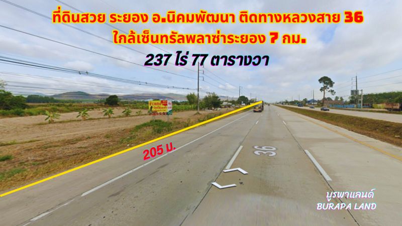 ขายที่ดินระยอง นิคมพัฒนา 237ไร่ 77ตรว. ใกล้เซ็นทรัลพลาซ่าระยอง 7 กิโลเมตร ผังสีเหลืองอ่อน
