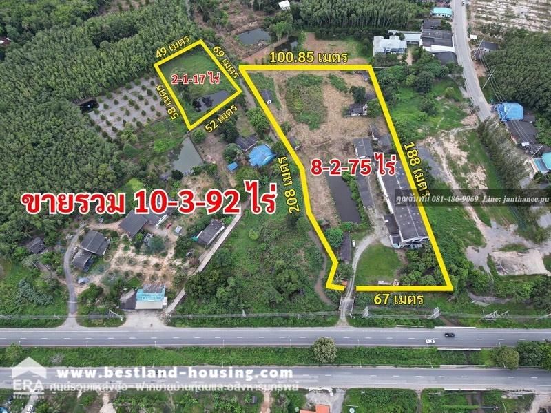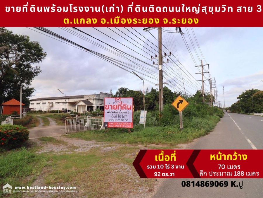 ขายที่ดินพร้อมโรงงาน(เก่า) สถานที่ตั้ง ต.แกลง อ.เมืองระยอง จ.ระยอง ที่ดินติดถนนใหญ่สุขุมวิท สาย 3 เนื้อที่ รวม 10 ไร่ 3 งาน 92 ตร.วา หน้ากว้าง ประมาณ 70 เมตร ลึก ประมาณ 188 เมตร