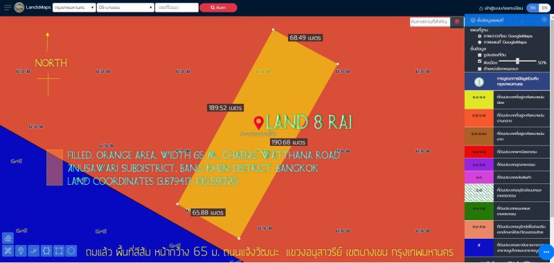 ที่ดิน8ไร่ ถมแล้ว พื้นที่สีส้ม หน้ากว้าง 65ม. ถนนแจ้งวัฒนะ แขวงอนุสาวรีย์ เขตบางเขน กรุงเทพมหานคร