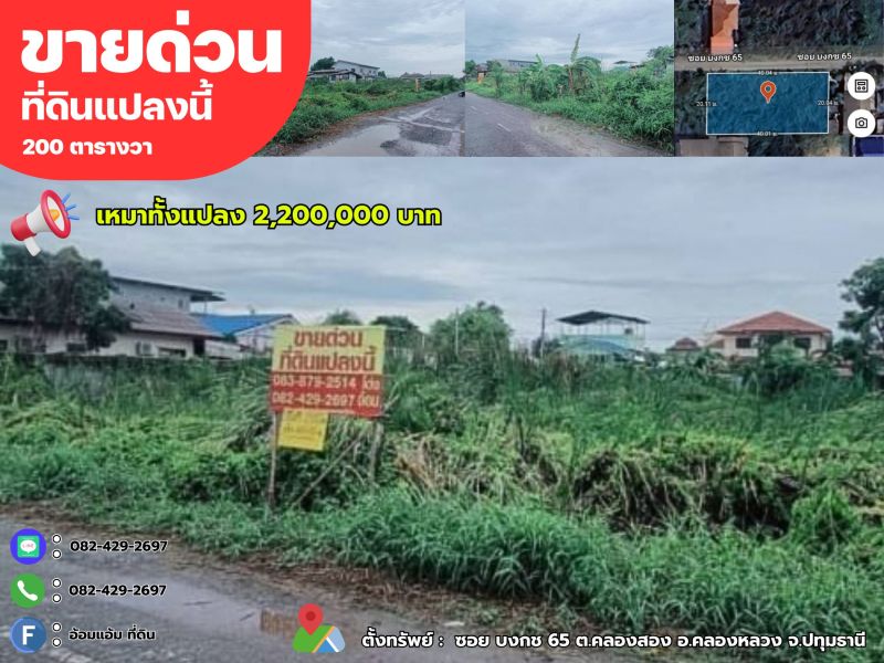 ขายด่วนที่ดินเปล่า 200 ตรว. ซอย บงกช 65 ต.คลองสอง อ.คลองหลวง จ.ปทุมธานี