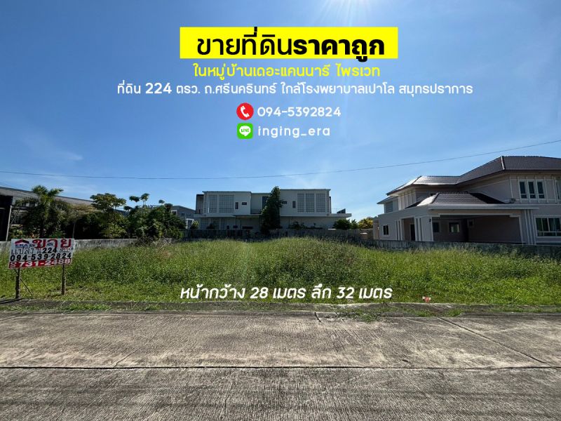 ขายที่ดินในหมู่บ้านเดอะแคนนารี ไพรเวท ถนนศรีนครินทร์ พื้นที่ 224 ตรว. ขายถูกวาละ 45,000 บาท ที่ดินถมแล้ว แปลงสวย ใกล้โรงพยาบาลเปาโล สมุทรปราการ