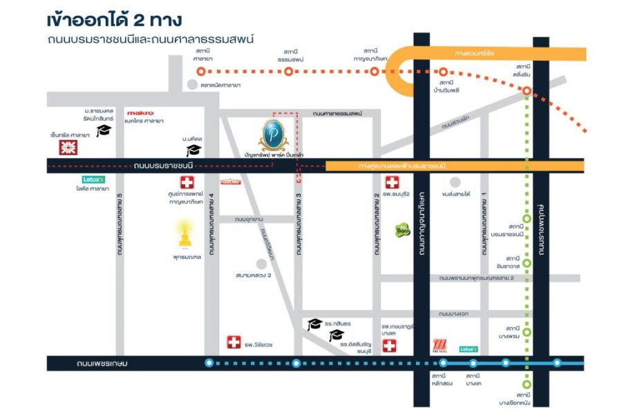 เข้า-ออก 2 เส้นทาง ถนนบรมราชชนนี และ ถนนศาลาธรรมสพน์