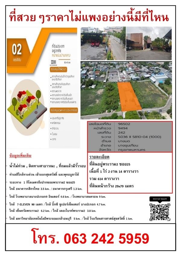 • ทำเลที่ตั้ง: ที่ดิน 614 ตรว. (1 ไร่ 2 งาน 14 ตรว.) ตำบลบางมด, อำเภอจอมทอง, กรุงเทพฯ