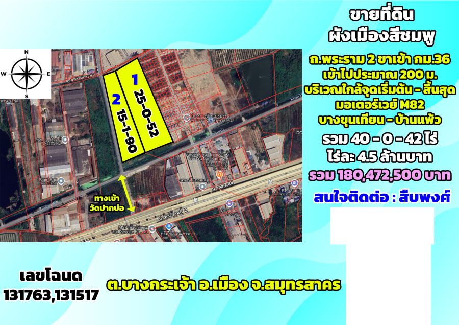 ขายที่ดิน ผังเมืองสีชมพู ถ.พระราม2 ขาเข้า กม.36 ต.บางกระเจ้า สมุทรสาคร