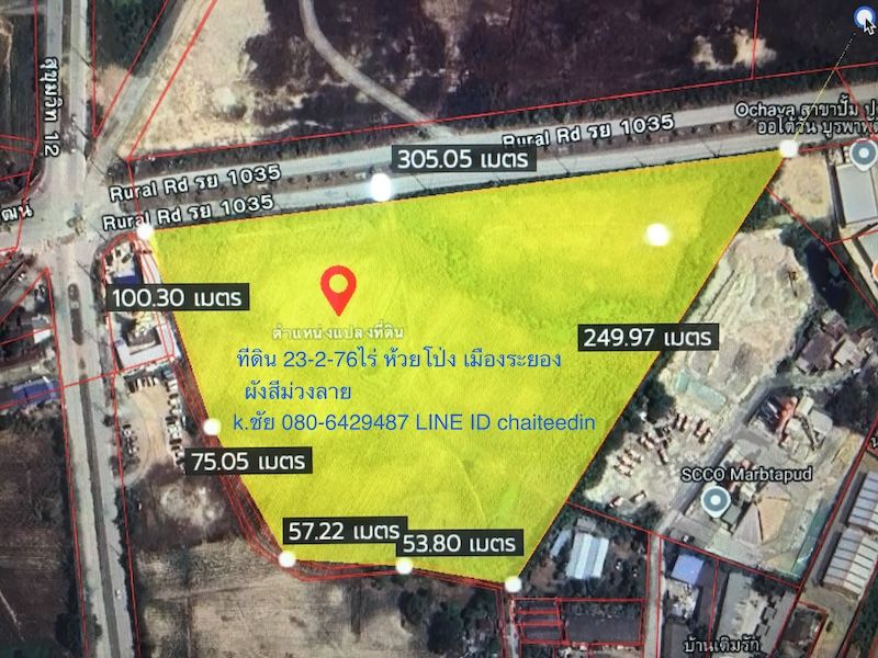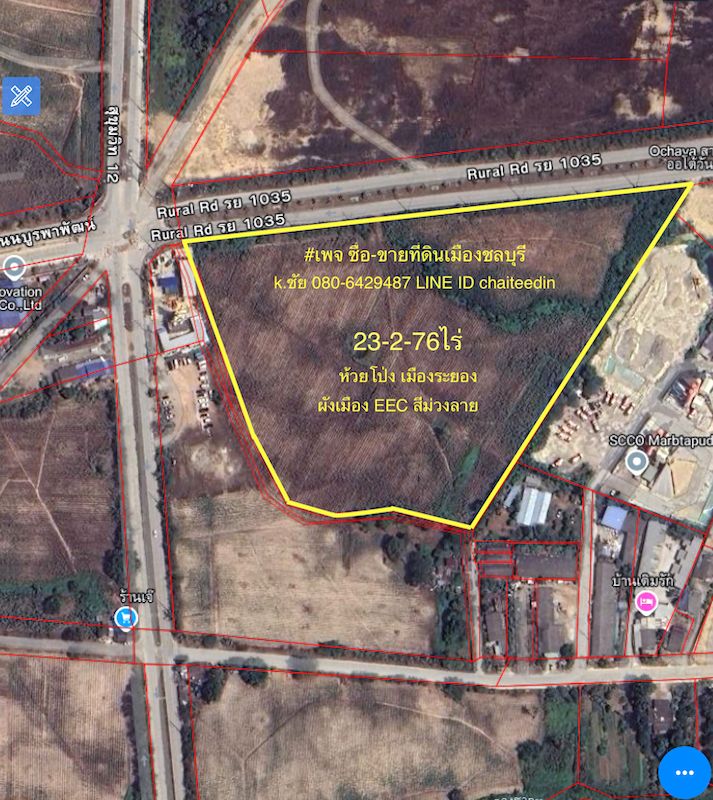 ขายที่ดินติดถนนบายพาส(ถ.บูรพาพัฒน์)เนื้อที่ 23.5ไร่ หน้ากว้าง 300เมตร ใกล้ปั้ม ปตท.แยกส้มหล่น ผังเมือง EEC สีม่วงลาย ต.ห้วยโป่ง อ.เมืองระยอง ใกล้นิคมเอเชีย,นิคมมาบตาพุด ห่างจากถนนบินอู่ตะเภา(เมืองการบิน) 12กม.โลบินสันบ้านฉาง 3กม. ราคาไร่ละ 5 ล้าน สนใจติดต่อคุณชัย 📞080-6429487 LINE ID chaiteedin เพจ ซื้อ-ขายที่ดินเมืองชลบุรี
