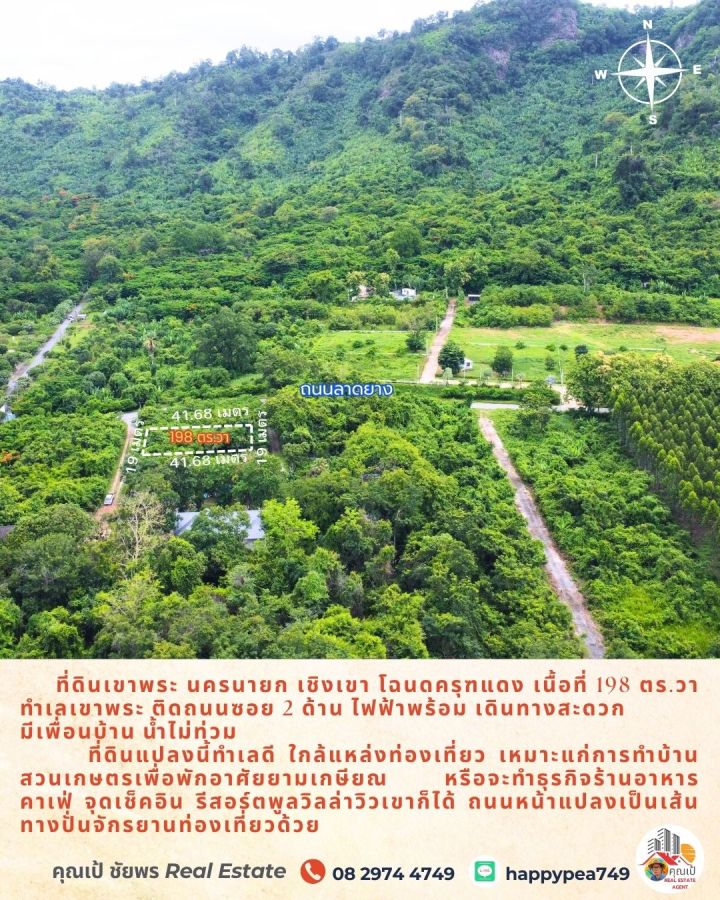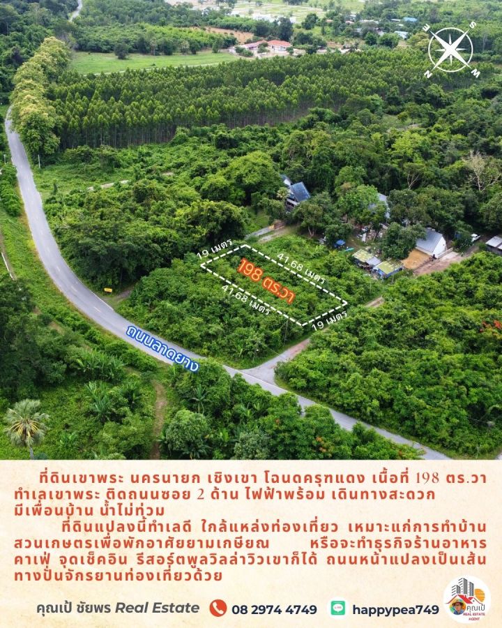 💰 ที่ดินเขาพระ นครนายก เชิงเขา เนื้อที่ 198 ตร.วา ทำเลเขาพระ ติดถนนซอย 2 ด้าน ไฟฟ้าพร้อม เดินทางสะดวก มีเพื่อนบ้าน น้ำไม่ท่วม (ไม่ได้ติดถนนลาดยางนะครับ มีแปลง นส.3 คั่นอยู่ 1 แปลง)