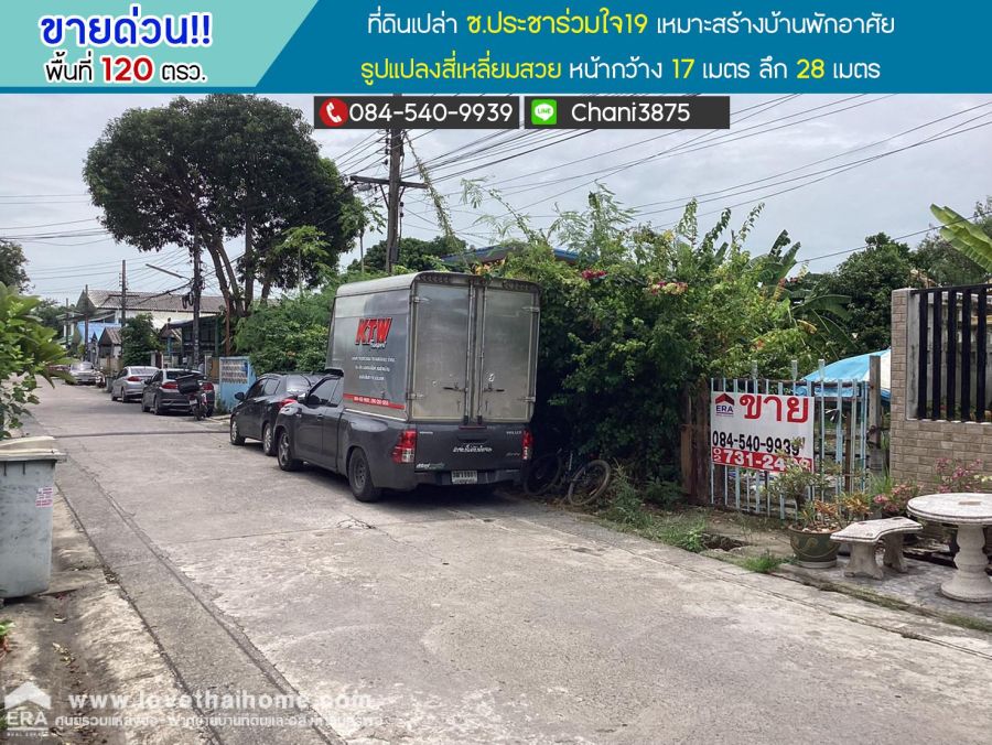 ข้อมูลเพิ่มเติม: ที่ดินเปล่า ซอยประชาร่วมใจ19 พื้นที่ 120 ตรว. หน้ากว้าง 17 เมตร ลึก 28 เมตร