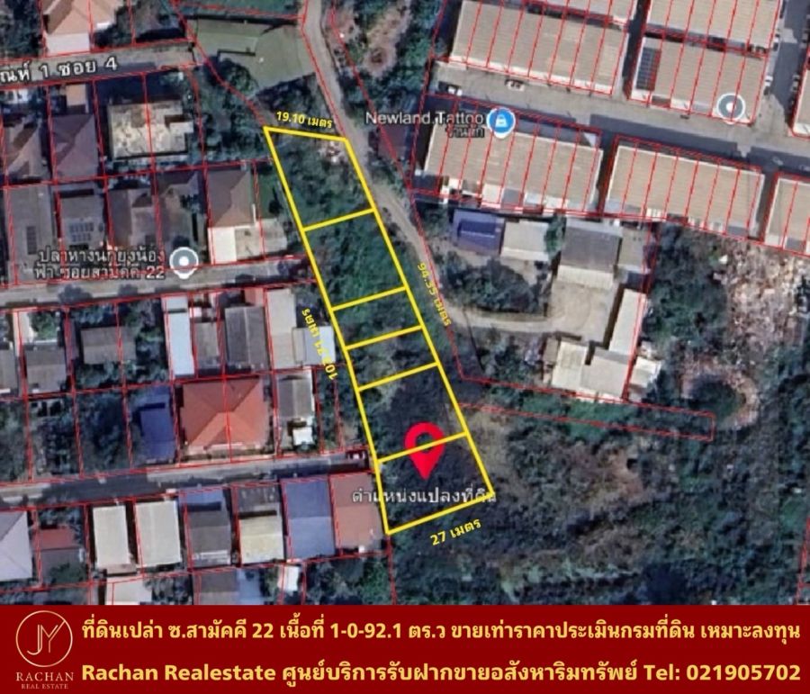 ขายด่วน ที่ดินเปล่า(ขายต่ำกว่าราคาตลาด) ซ.สามัคคี 22 ต.ท่าทราย อ.เมืองนนทบุรี จ.นนทบุรี เนื้อที่ 1-0-92.1 ตร.ว ผังที่ดินสีส้ม ขนาด หน้ากว้าง 94.35 เมตร ลึก 27 เมตร ถนนหน้าที่ดินกว้าง 6 เมตร หน้าที่ดินติดถนนหันทิศตะวันออกเฉียงเหนือ เข้าซอยสามัคคี22 ประมาณ 400เมตร ถึงที่ตั้งทรัพย์ ไฟฟ้าและปะปาเข้าถึง สามารถสร้างที่อยู่อาศัยได้หลายรูปแบบ เช่น บ้านเดี่ยว,ทาวน์เฮาส์, คอนโด,อพาร์ตเมนต์ และอาจรวมถึงอาคารพาณิชย์บางประเภท เช่น สำนักงาน หรือโรงแรมได้ด้วย