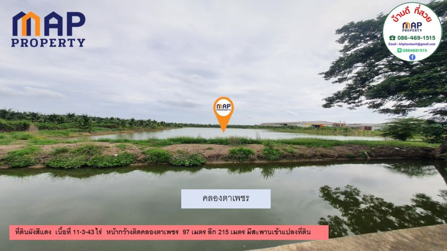 -ด้านหน้าติดคลองตาเพชร ยาว 97 ม. มีสะพานคอนกรีตเข้าที่ดินจากถนนเลียบคลองตาเพชร