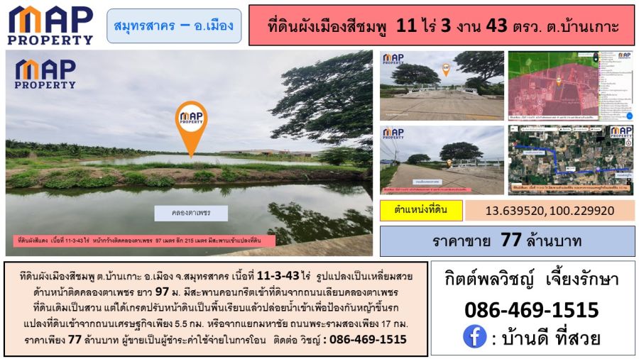 ที่ดินผังเมืองสีชมพู ต.บ้านเกาะ อ.เมือง จ.สมุทรสาคร เนื้อที่ 11-3-43 ไร่ รูปแปลงเป็นเหลี่ยมสวย