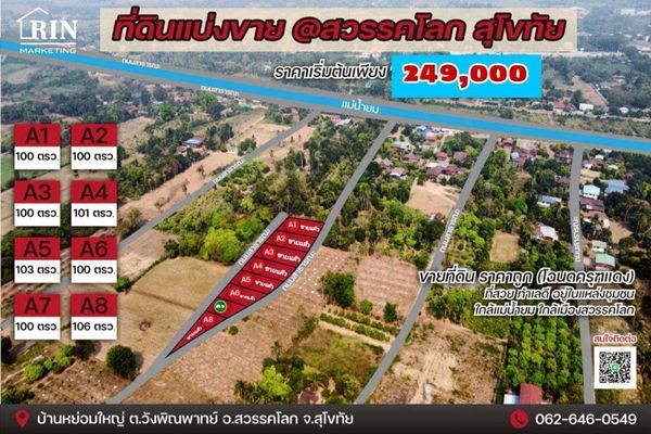 ขายที่ดินสวย ราคาถูก เมืองสวรรคโลก ที่ดิน ขนาด 100 ตารางวา อยู่ในแหล่งชุมชน หน้ากว้างติดถนนคอนกรีต 18 เมตร เหมาะสร้างบ้าน