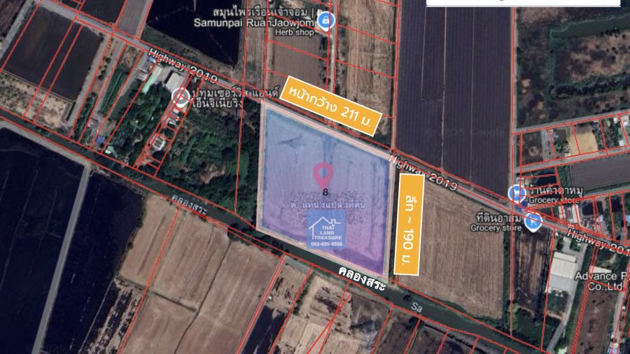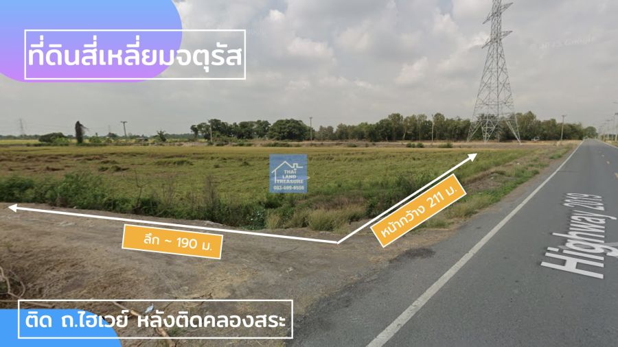 ที่ดินรูปสี่เหลี่ยมจตุรัส 23 ไร่ ๆ ละ 2.85 ลบ. หน้ากว้าง 211 ม. (+29 ไร่ ๆ ละ 2 ลบ.) ติด ถ.ไฮเวย์ หลังติดคลองสระ (ผังเมืองสีเขียว) หันหน้าทิศเหนือ