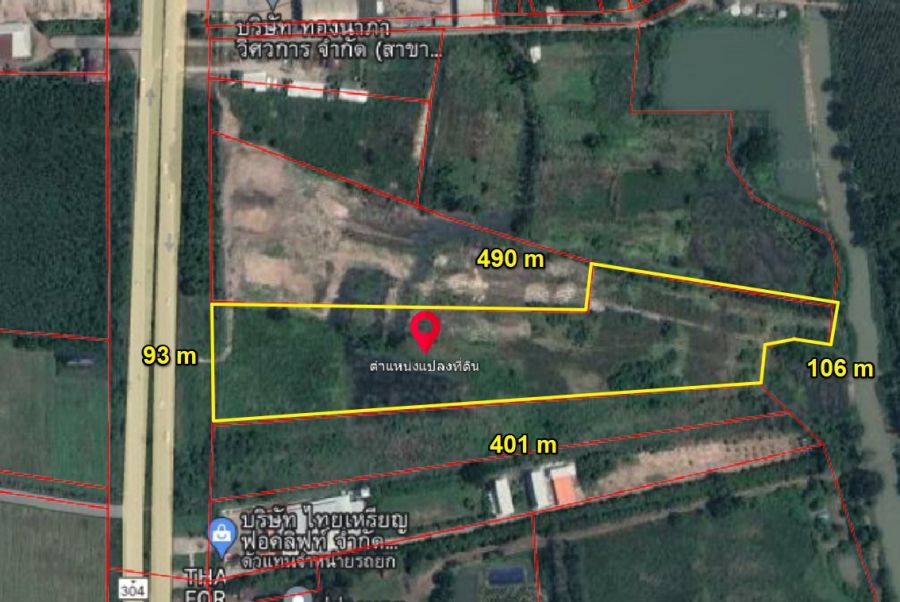 หน้ากว้างติดถนนเส้น 304 93 เมตร X ยาว 490 เมตร
