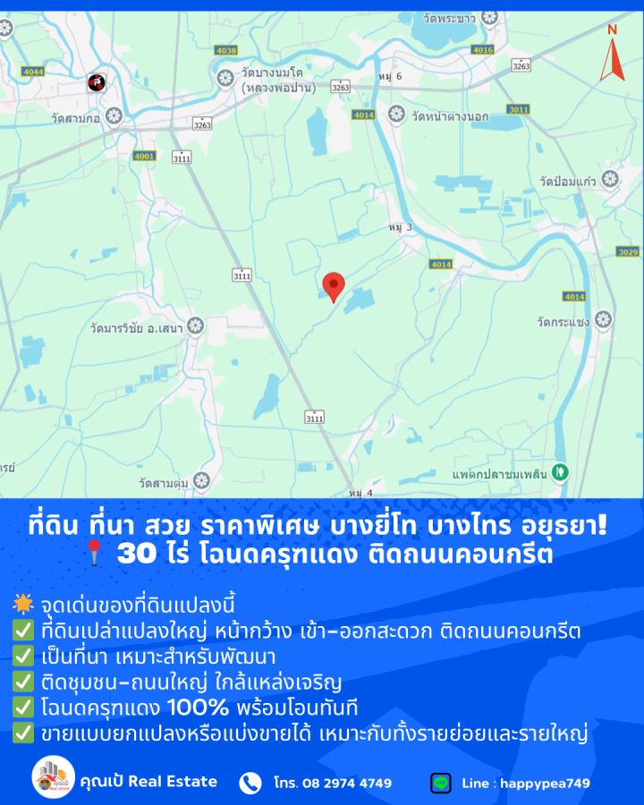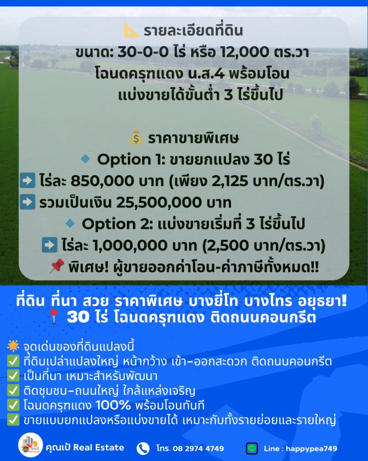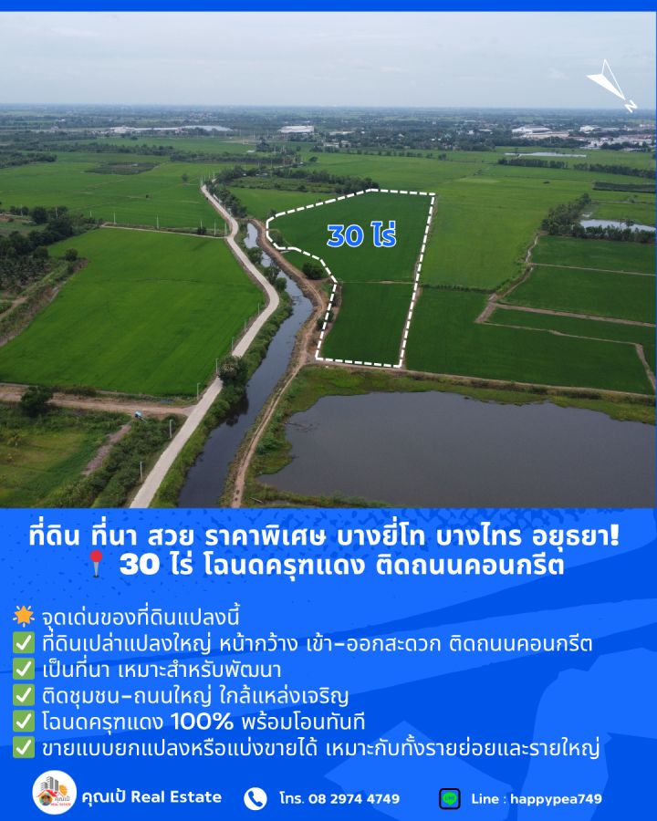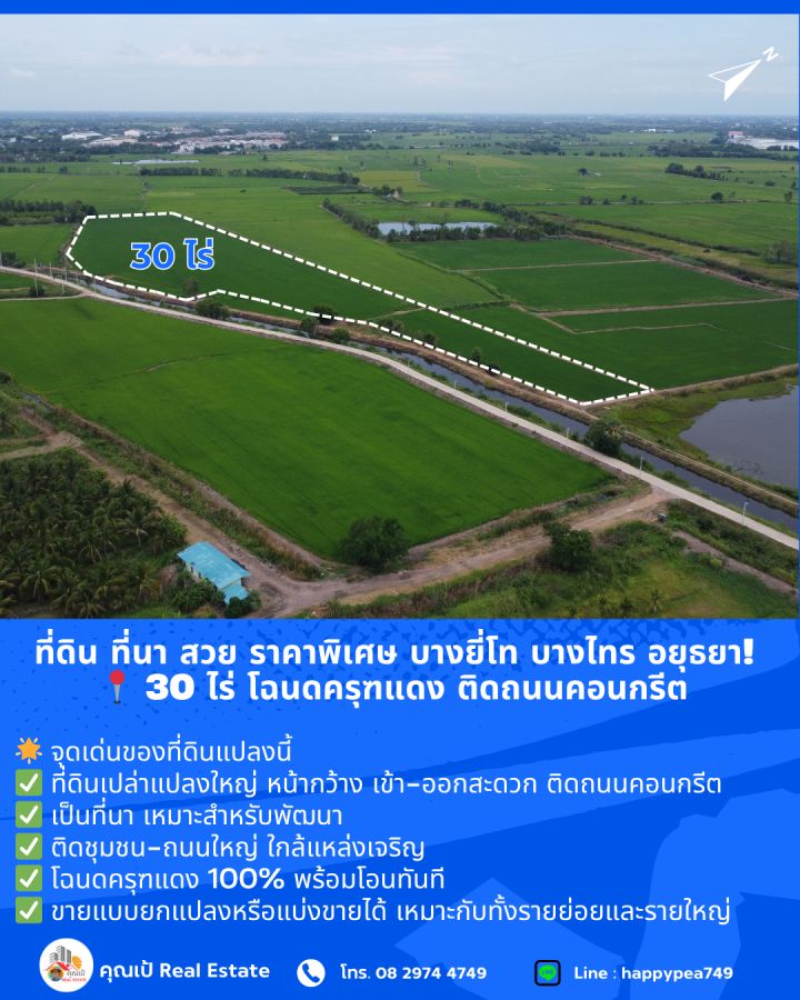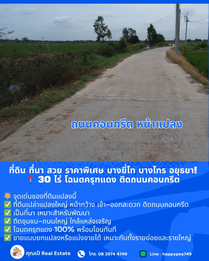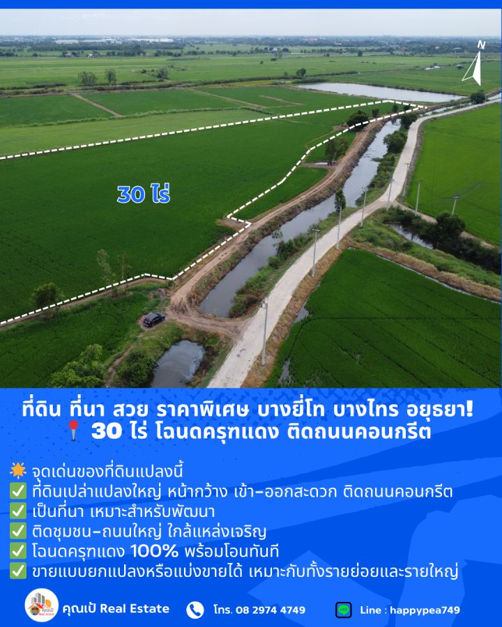🚨 ที่ดิน ที่นา บางไทร อยุธยา! สวย ราคาพิเศษ 📍 ขนาด 30 ไร่ โฉนดครุฑแดง ติดถนนคอนกรีต 🔥 ขายถูกที่สุดในย่านนี้ เริ่มต้นเพียงไร่ละ 850,000 บาท!!