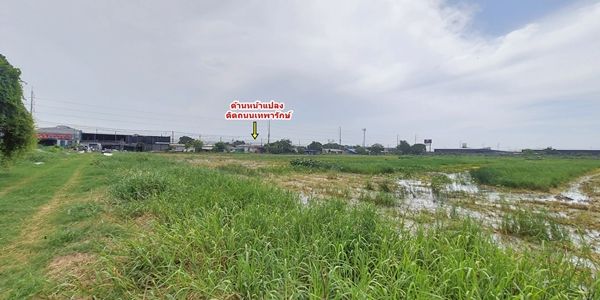 ขายที่ดินเปล่าสมุทรปราการ ทําเลทอง ย่านธุรกิจ ติดถนน เทพารักษ์ (ฝั่งขาเข้าเมือง) ราคาถูก รูปแปลงสวย เนื้อที่ 59-0-15 ไร่ (เป็นที่นา ถมไม่เยอะ) ผังเมืองสีเขียวเข้ม