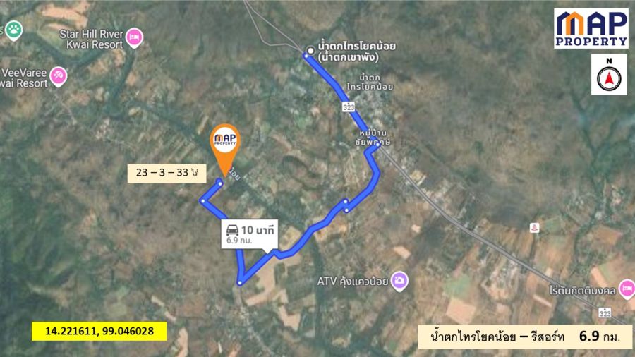 - เนื้อที่ประมาณ 9ไร่ 3 งานกว่าหน้าแปลงติดถนนสาธารณะ ด้านหลังติดแม่น้ำแควน้อยสภาพปัจจุบันทำเป็นรีสอร์ทมีบ้านพัก 9 หลัง อีก 1 หลังเป็นพักตากอากาศส่วนตัว และพื้นที่อีกส่วนทำสวนผลไม้ หากจะพัฒนาหรือดำเนินกิจการรีสอร์ทต่อได้เลย ที่ดินส่วนที่ 2 เนื้อที่ประมาณ 13 ไร่ 3 งานกว่า หัวแปลงท้ายแปลงติดถนนสาธารณะ ปัจจุบันทำไร่มันสำปะหลังหากจะแบ่งจัดสรรแบ่งเป็นแปลงเล็กก็ง่ายต่อการขายสำหรับทำบ้านพักตากอากาศ