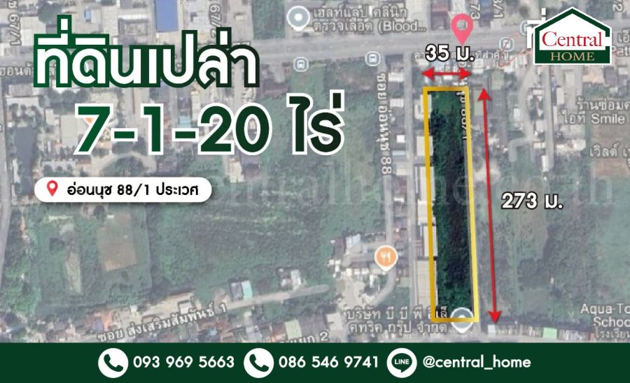 - ที่ดินเปล่า เนื้อที่ 7-1-20 ไร่ กว้าง 35 เมตร ลึก 273 เมตร