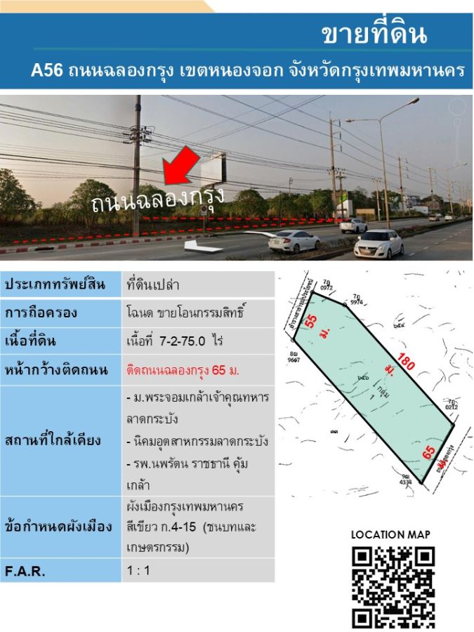 ขายที่ดิน เนื้อที่ 7-2-75 ไร่ หน้ากว้างที่ดิน 65 เมตร ติดถนนฉลองกรุง