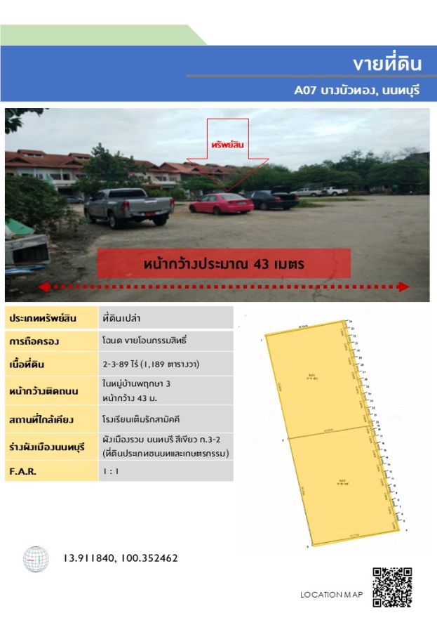 ขายที่ดินเปล่าเนื้อที่ 2-3-89 ไร่ (1,189 ตารางวา) ต.บางคูรัด อ.บางบัวทอง จ.นนทบุรี