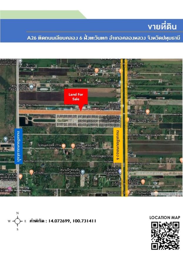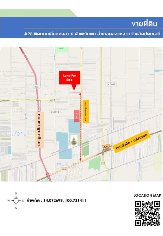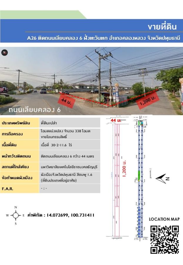 หน้ากว้างติดถนนเลียบคลอง 6 กว้าง 44 เมตร