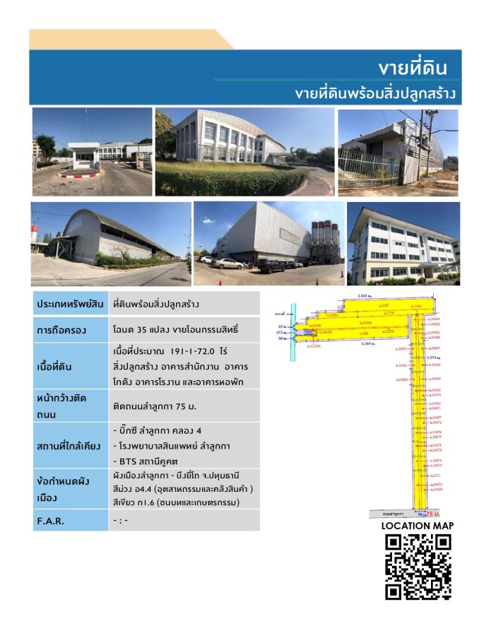 ขายที่ดินพร้อมสิ่งปลูกสร้าง เนื้อที่ 191-1-72 ไร่ ติดถนนลำลูกกา คลอง 4