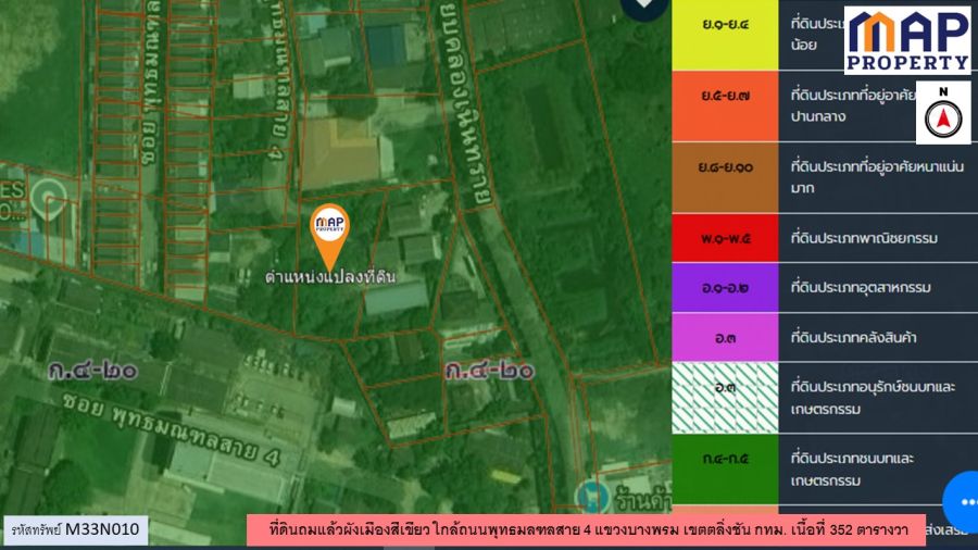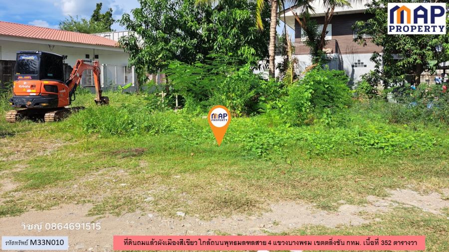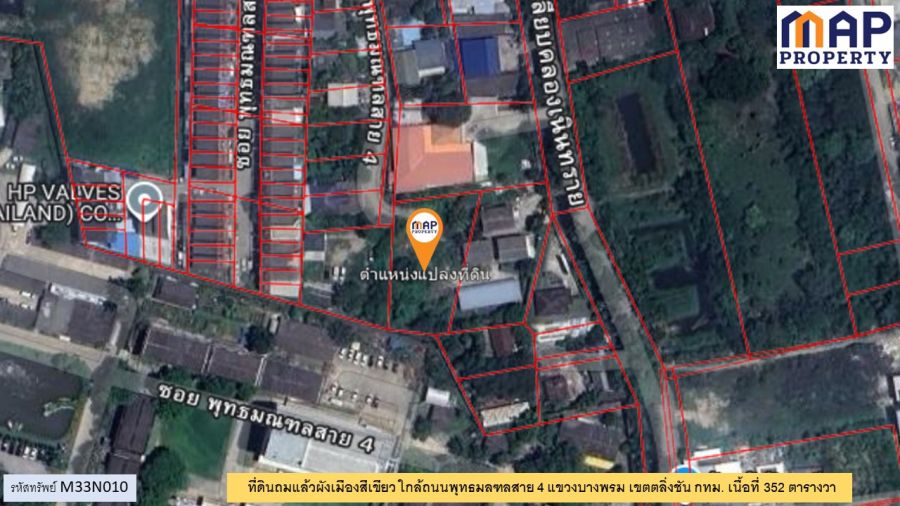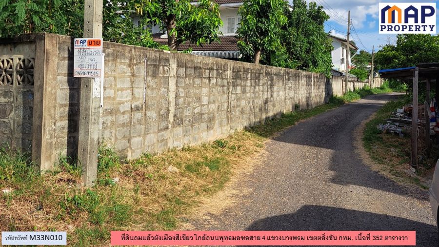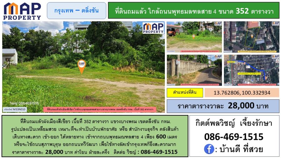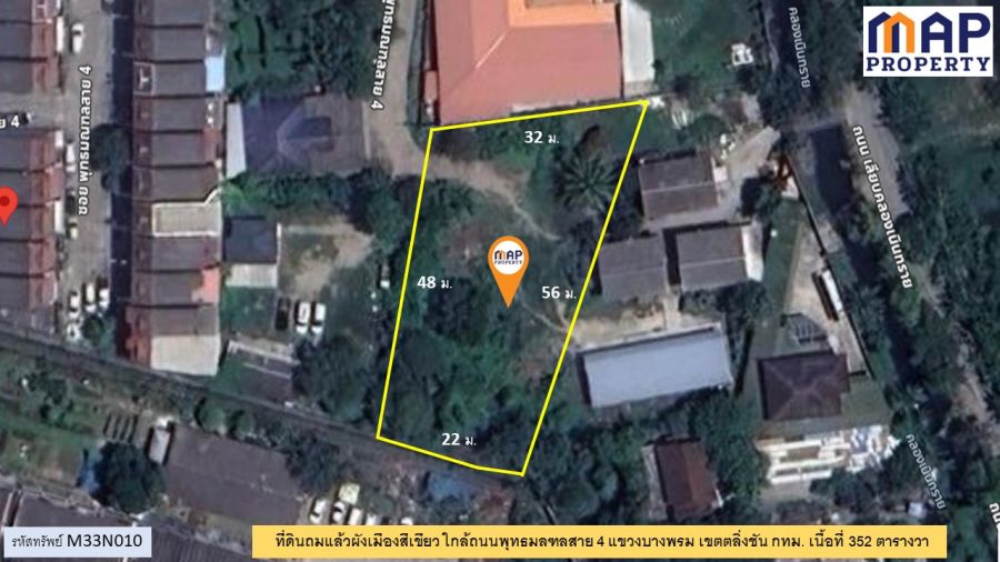 ที่ดินถมแล้วผังเมืองสีเขียว เนื้อที่ 352 ตารางวา แขวงบางพรม เขตตลิ่งชัน กทม. รูปแปลงเป็นเหลี่ยมสวย