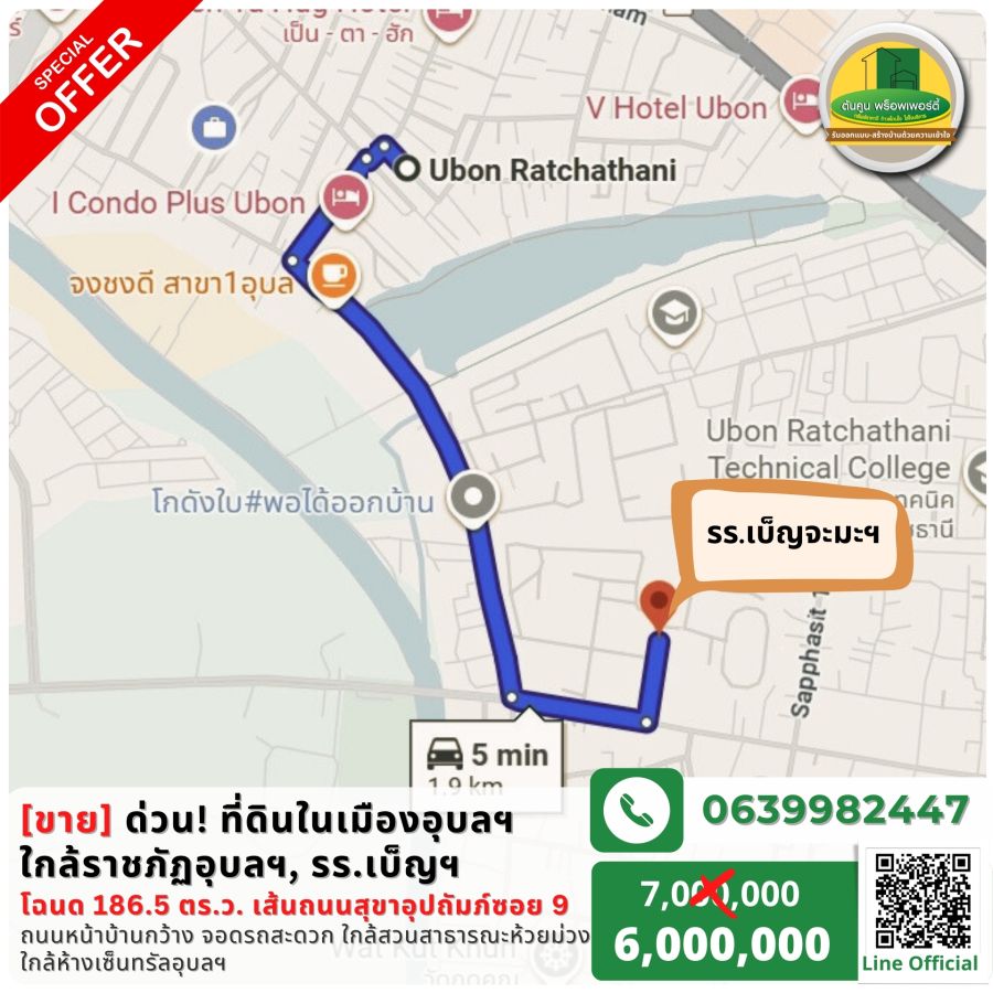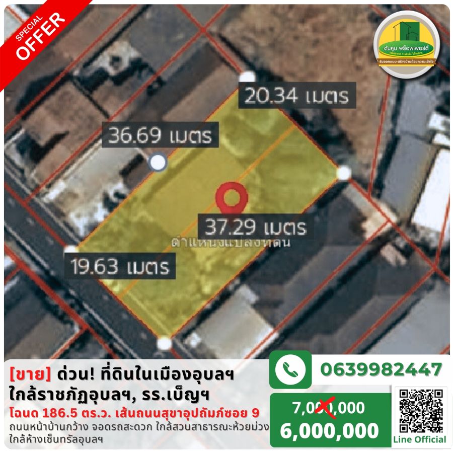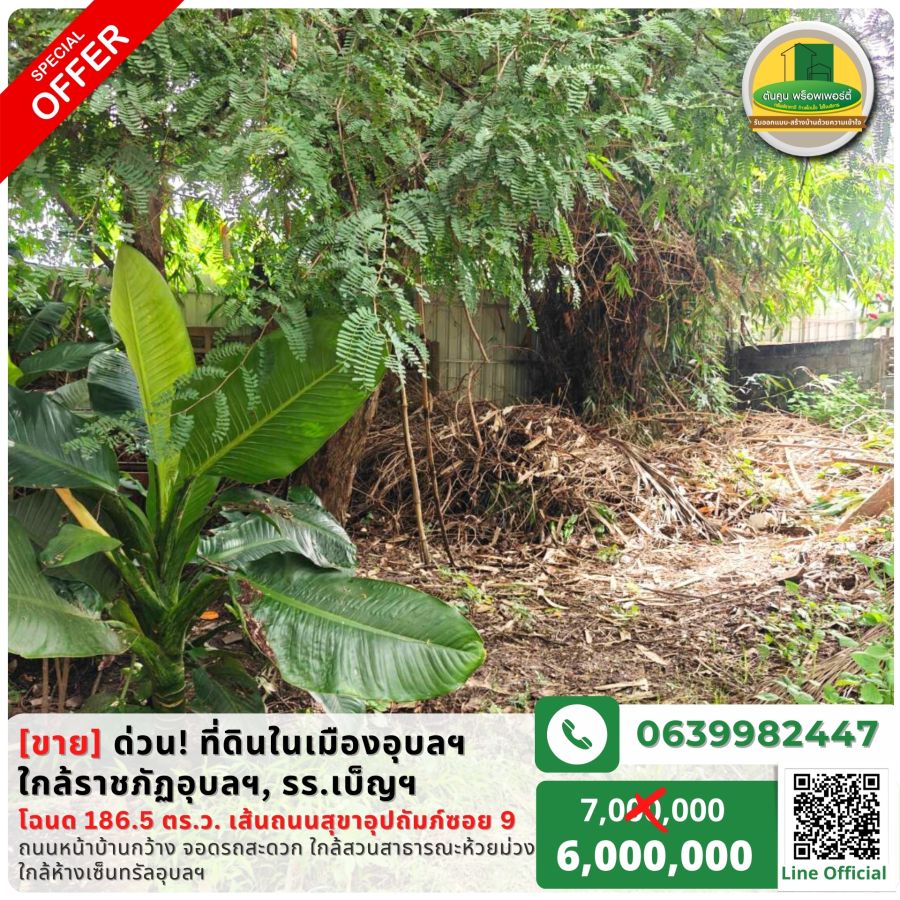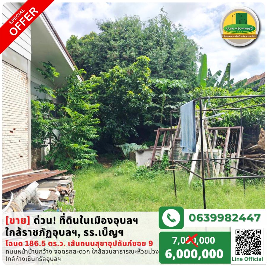 ด่วน! ที่ดินในเมืองอุบลฯ ใกล้ราชภัฏอุบลฯ, รร.เบ็ญฯ เส้นถนนสุขาอุปถัมภ์ซอย 9 เนื้อที่ 186.5 ตร.ว.