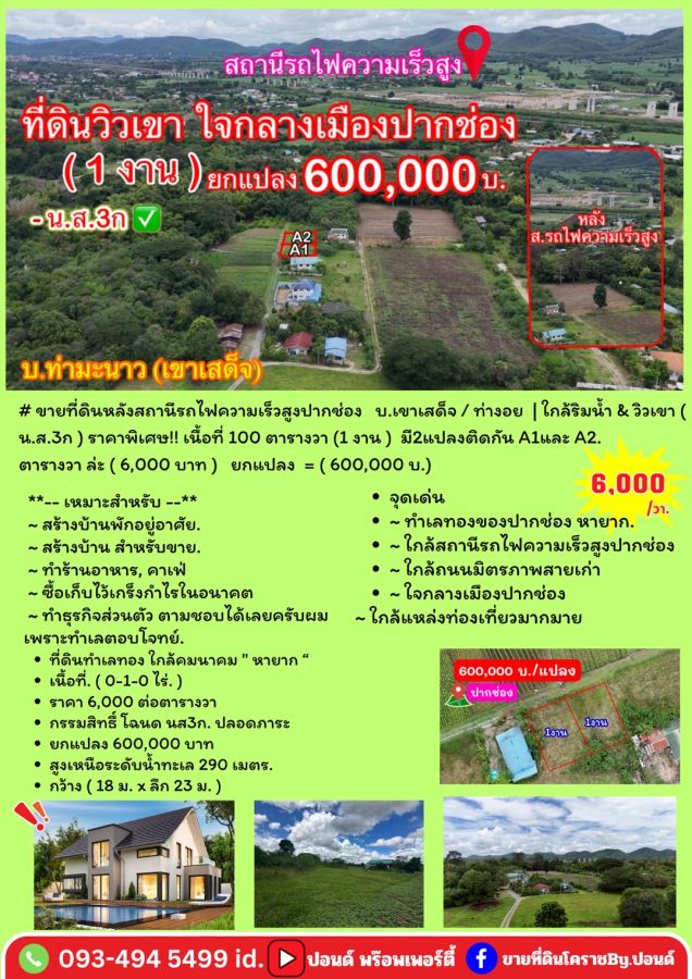 ขายที่ดินหลังสถานีรถไฟความเร็วสูงปากช่อง บ.เขาเสด็จ / ท่างอย | ใกล้ริมน้ำ & วิวเขา ( น.ส.3ก ) ราคาพิเศษ!!