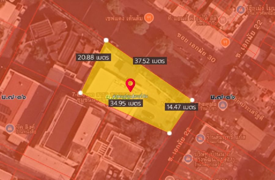 ที่ดินขนาด159ตรว.ผังเมืองสีแดง รูปแปลงสี่เหลี่ยมด้านไม่เท่า