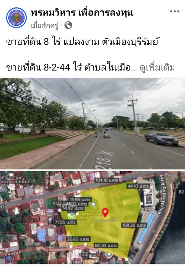 ขายที่ดิน 8-2-44 ไร่ ตำบลในเมือง อำเภอเมืองบุรีรัมย์ บุรีรัมย์ ที่ดินตั้งติดถนนจิระ (สาย 218) ห่างจากศาลหลักเมือง 300 ม. ห่างจากถนนคนเดินเซราะกราวบุรีรัมย์ 1 กม. ที่ดินหน้ากว้างติดภนนจิระ 105 ม. ลึกประมาณ 105 ม.