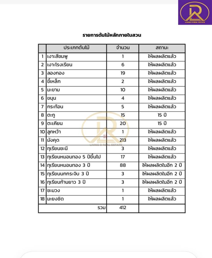 • พื้นที่ที่ดินเป็นสวนผสม มีผลไม้เต็มพื้นที่ พร้อมให้ผลผลิต มังคุด ทุเรียน และอื่นๆ(ตามรายการที่แสดงในเอกสารแนบ)