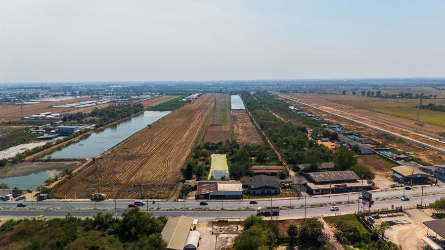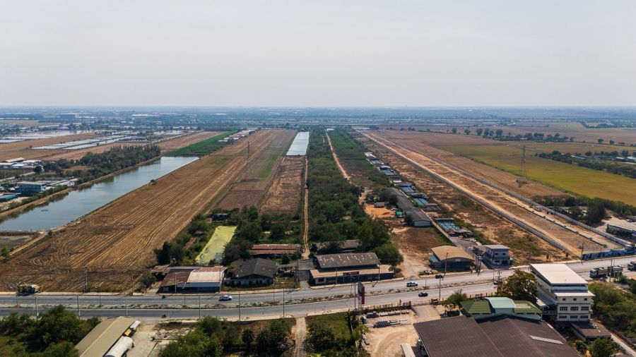 - ด้านหลัง: ถนนชนบทสมุทรปราการ 6004 หน้ากว้าง 43.48 เมตร