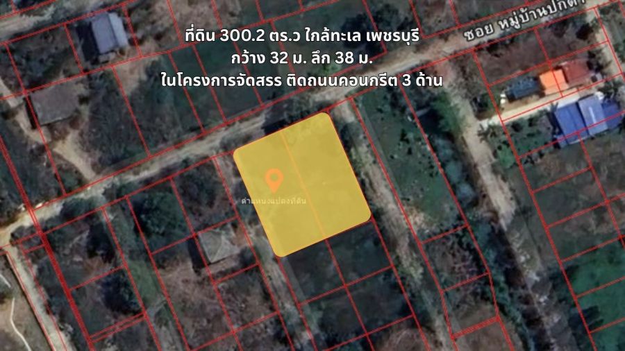 ที่ดิน 300.2 ตร.ว. ในโครงการปากิตา เพชรบุรี แปลงมุมติดถนน 3 ด้าน อยู่ใกล้หาดหัวตาล 2 กม. หาดเจ้าสำราญ–ปึกเตียน 5 กม. เหมาะสร้างพูลวิลล่า บ้านพักตากอากาศ และลงทุนในโซนทะเลที่กำลังเติบโต