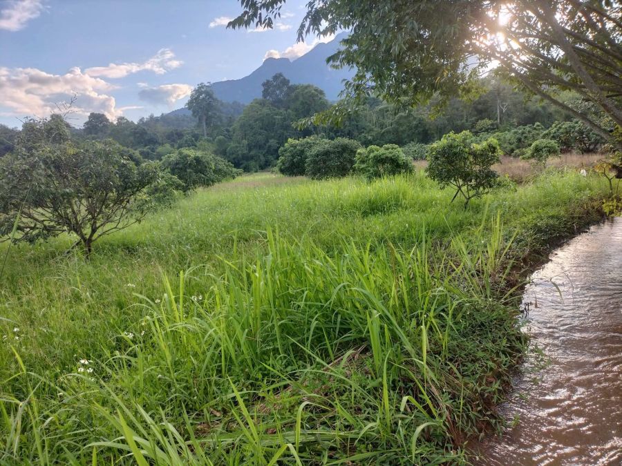 เป็นสวนลำไยและมีฝายน้ำผ่านแปลง มีน้ำทั้งปี