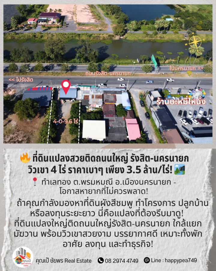 ลองนึกภาพ... คุณยืนอยู่บนที่ดินแปลงนี้ หันไปทางไหนก็เห็นวิวเขาสวยงาม ด้านหน้าติดถนนใหญ่รังสิต-นครนายก การเดินทางสะดวกสบาย รถวิ่งผ่านทุกวัน ไม่ต้องกังวลเรื่องการเข้าถึง ด้านข้างมีร้านอาหารดังอย่างบะหมี่โหน่ง ชะชะช่า เพียงแค่ 50 เมตร บรรยากาศร่มรื่นด้วยต้นมะม่วงที่มีอยู่แล้ว บริเวณนี้เป็นชุมชนที่กำลังเติบโต เหมาะสำหรับการพัฒนาโครงการที่พักอาศัย ธุรกิจร้านค้า รีสอร์ท หรือแม้กระทั่งทำเกษตรสวนมะยงชิด