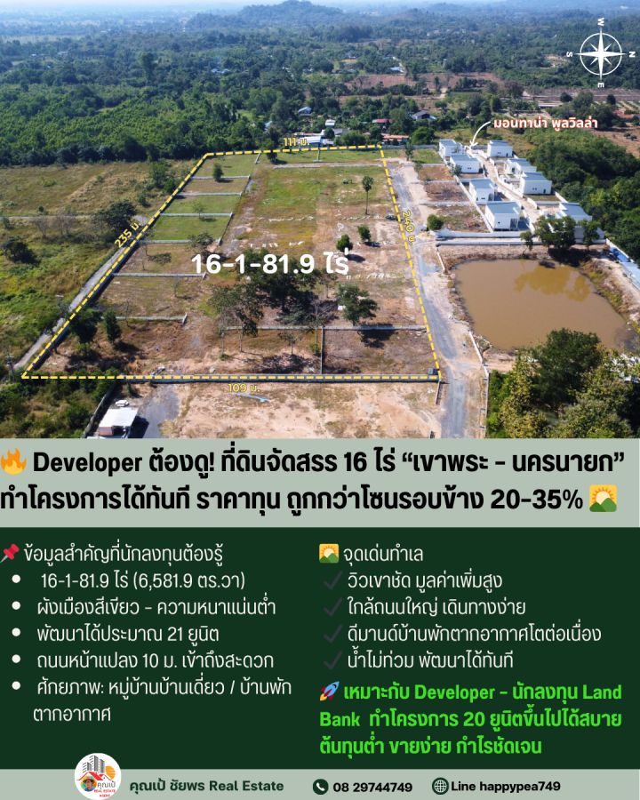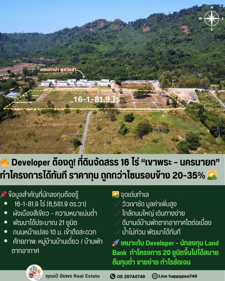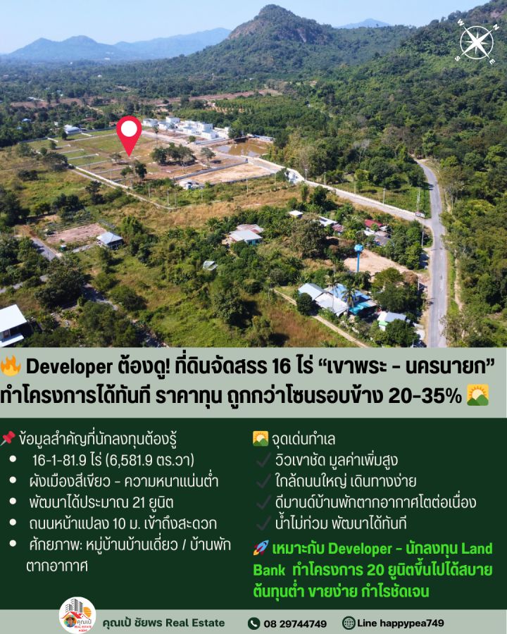 📍 ทำเล: ต.เขาพระ อ.เมืองนครนายก (แหล่งท่องเที่ยวและบ้านพักตากอากาศชั้นนำ) 📏 ขนาด: 16-1-81.9 ไร่ (6,581.9 ตร.ว.) 💰 ราคาลงทุน: เพียง 4,558 บาท/ตร.ว. (1.82 ล้านบาท/ไร่) ฟรีโอน!
