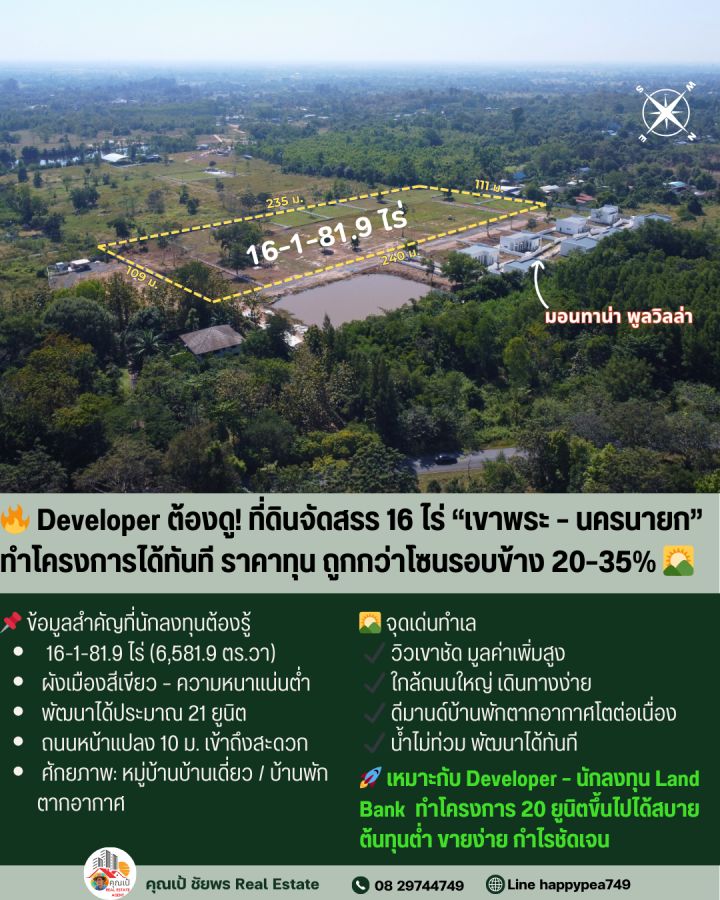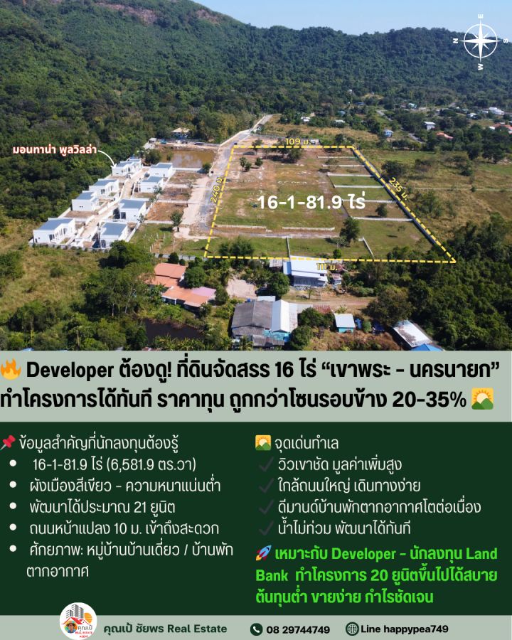 ✅ วิวเขาโอบล้อม 360 องศา: ขายวิวได้ทุกยูนิต (Mountain View is King ในตลาดนี้) ✅ รูปแปลงสวย: หน้ากว้างติดถนน เข้าออกง่าย วางผังโครงการได้สวย ไม่เสียพื้นที่เศษ ✅ Location Hub: ใกล้แหล่งท่องเที่ยวสำคัญ (อุทยานพระพิฆเนศ, น้ำตกสาริกา) แต่ยังคงความเงียบสงบ ✅ Price Gap: ราคาเสนอขาย ต่ำกว่าราคาตลาด ในทำเลวิวเขา (ปกติโซนนี้เริ่มขยับไป 2-2.5 ล้าน/ไร่) = มี Margin เหลือสำหรับการตลาดและก่อสร้าง