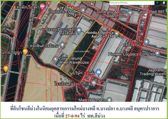 ขายที่ดินสีม่วงคลอส่งน้ำสุวรรณภูมิ บางปลา เนื้อที่ 27-0-94 ไร่ ขายไร่ละ 16 ล้าน ต.บางปลา บางพลี สมุทรปราการ