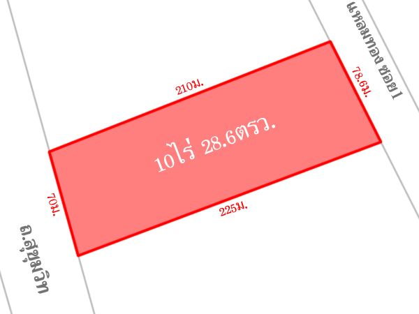 หน้ากว้างติดถนน 70 ม. ลึก 210 ม. ด้านหลังติดถนน 78.6 ม.
