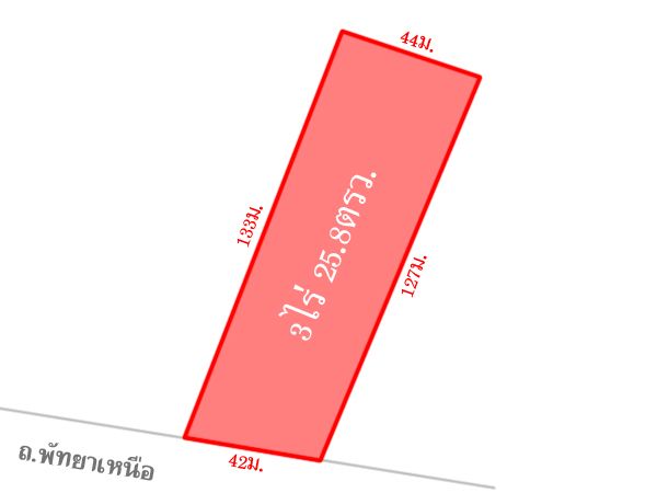 หน้ากว้างติดถนน 42 ม. ลึก 133 ม. ด้านหลังกว้าง 44 ม.