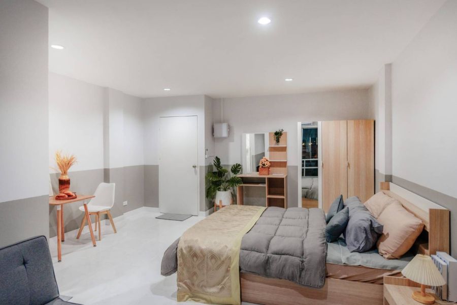 เฟอร์นิเจอร์ครบชุด: ตู้เสื้อผ้า, เตียง 5 ฟุต + ที่นอน, โต๊ะข้างเตียง, โต๊ะเครื่องแป้ง, ชั้นวางทีวี, โซฟา 2 ที่นั่ง, โต๊ะอาหารพร้อมเก้าอี้ 2 ที่นั่ง
