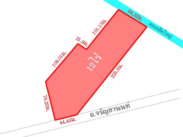 หน้ากว้างติดถนน 44.45 ม. ลึก 229.90 ม. ด้านหลังกว้าง 68.32 ม.ติดคลองลัดใหญ่