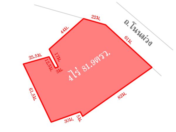 หน้ากว้างติดถนน 83 ม. ลึก 112 ม. ด้านหลังกว้าง 61.5 ม.
