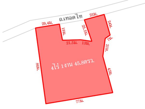 หน้ากว้างติดถนน 23 ม.และ 29.4 ม. ลึก 86 ม. ภายในที่ดินกว้าง 77 ม.