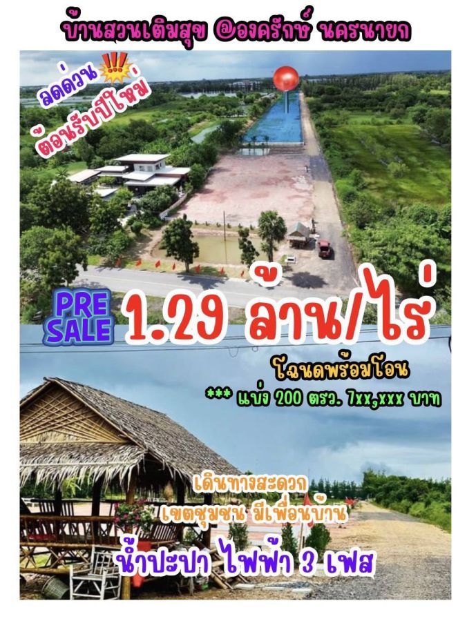 ลดจริง ไม่จกตา จาก 1.4 ล้าน/ไร่ เหลือเพียง 1.29 ล้าน/ไร่ บ้านสวนเต็มสุข องครักษ์ นครนายก โฉนดพร้อมโอน ใกล้ชุมชน มีเพื่อนบ้าน เดินทางสะดวก