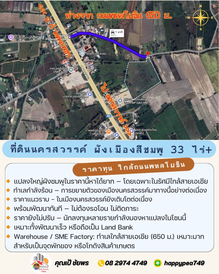 ทำเลดี เข้าซอยจากถนนพหลโยธิน (สายเอเชีย) เพียง 650 เมตร รถสวนได้ เหมาะสำหรับทำ "โครงการบ้านราคาประหยัด" หรือ "โกดัง/ศูนย์กระจายสินค้า" เพราะต้นทุนที่ดินถูกมาก ทำให้ตั้งราคาขายสินค้าได้เปรียบตลาดสุดๆ